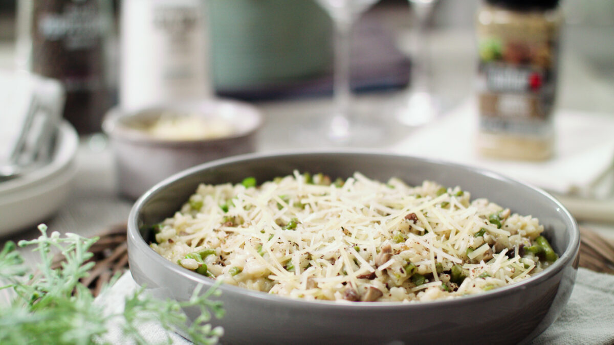 - In a large pot, add 1 tbsp olive oil, risotto and onion. Stir together on medium high heat for 2 to 3 minutes. Add chicken broth and Weber® Garlic Parmesan Seasoning. Stir and bring to a boil. Cover, reduce the heat to low and cook for 20 minutes.